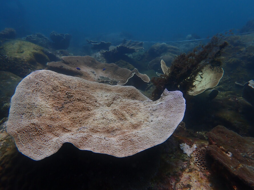 我們將厚度<1mm的泥的部份搧開,並記錄泥下覆蓋的底質,分析後發現,5m處被泥沙覆蓋的生物類別中有78.4%藻類與2.7%硬珊瑚,10m處有80.8%藻類與1.0%硬珊瑚,其餘比例為非生物類的岩石碎石與沙。
